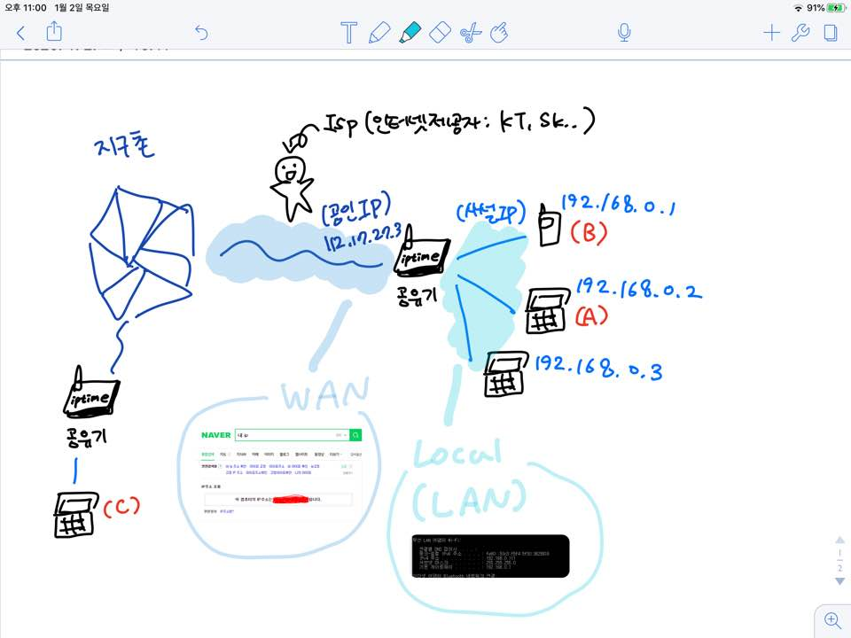 네이버에 '내ip'를 검색해서 나온 ip는 공인ip이고 ipconfig로 검색해서 본 wifi ipv4는 사설ip이다.