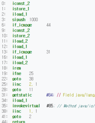 바이트 코드란? JVM이 읽을 수 있는 코드를 뜻한다. cpu가 0110101과 같은 이진코드를 읽을 수 있듯이 cpu역할을 하는 jvm은 아래와 같이 생긴 바이트 코드를 읽을 수 있다.